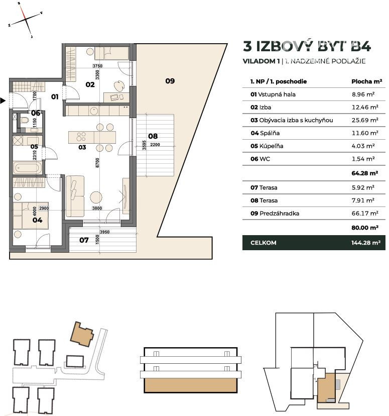 Cena 3 izbového bytu na 1 podlaží/prízemí o výmere 64,28m2 + 79m2 záhrada s terasami je 352.355EUR + parkovanie + poplatok za prácu predajcu spojenú s nadobudnutím nehnuteľnosti 1%